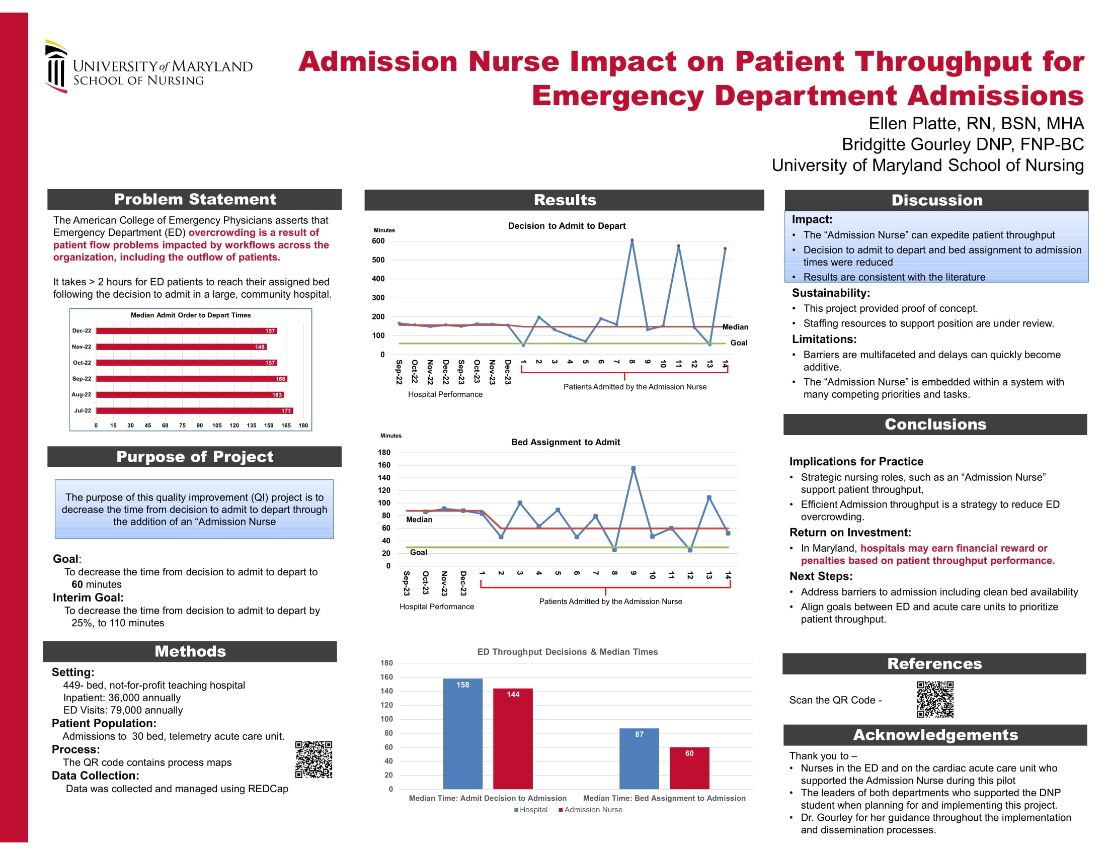 Platte, E., & Gourley, B. (2024 Apr). Admission Nurse Impact on Patient Throughput for Emergency Department Admissions. Presented at the Temple University Hospital Research and EBP Conference, Philadelphia, PA.